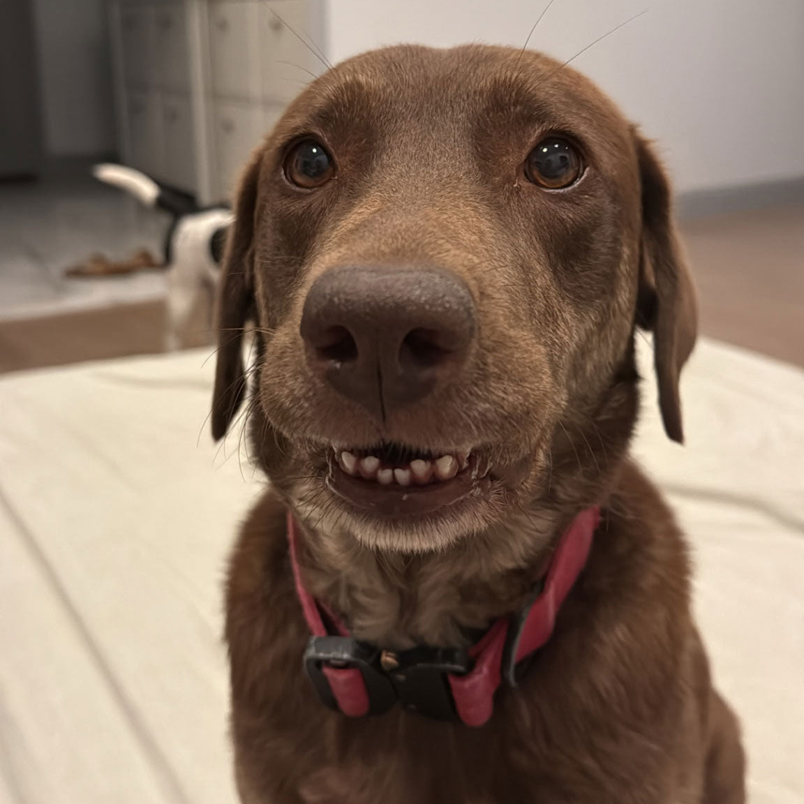 Artie is our sweet, goofy girl with big dog energy in a full-size body. She’s playful, silly, and full of personality, always flashing those iconic crooked teeth. Whether she’s doing zoomies, demanding playtime, or serving as our very dedicated treat taste-tester, Artie brings joy (and chaos) everywhere she goes.